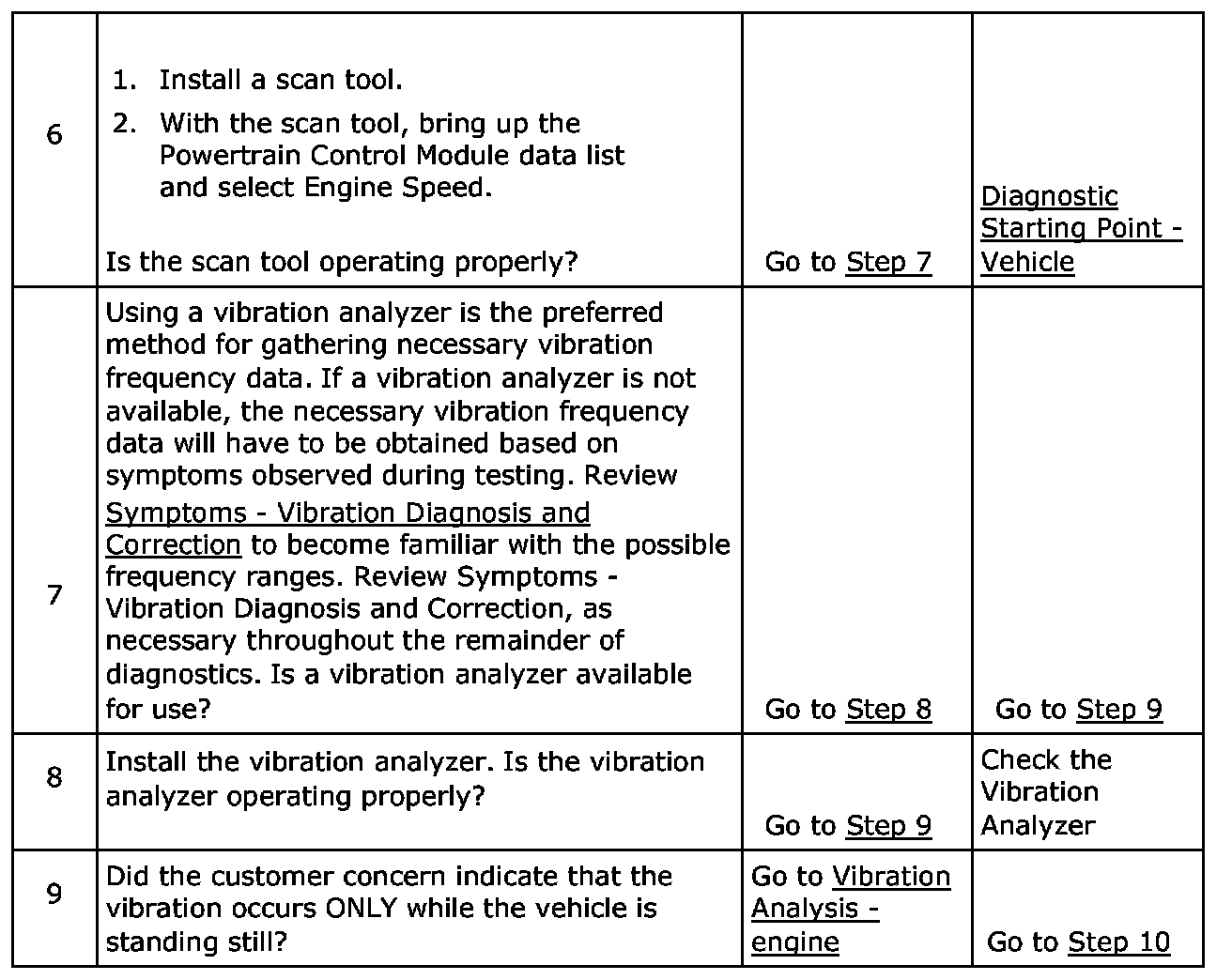 The numbers below refer to the step numbers on the diagnostic table.