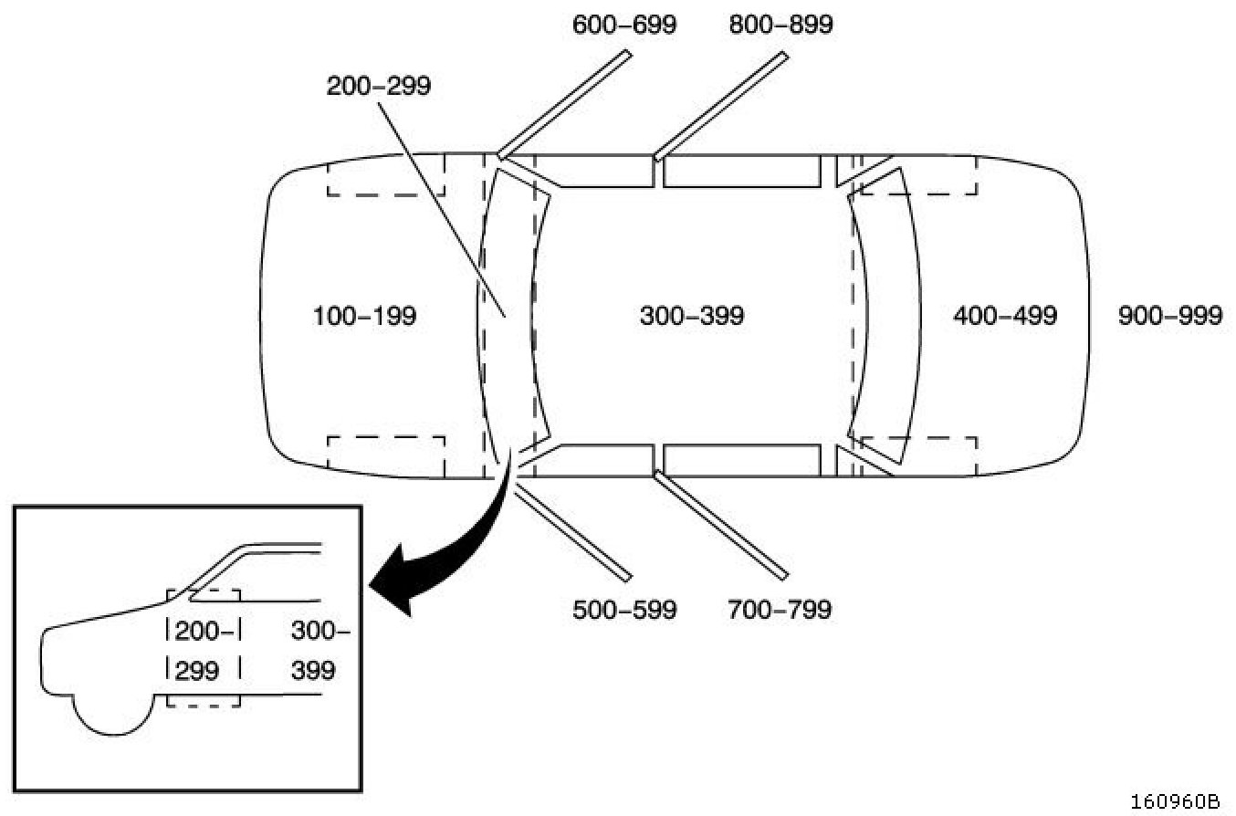 All grounding points, in-line connectors, pass-through grommets, and splices have reference numbers that correspond to where they are located in the vehicle. The table explains the reference number system.