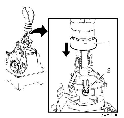 1. Install reverse gear block (2) to transmission control lever knob.