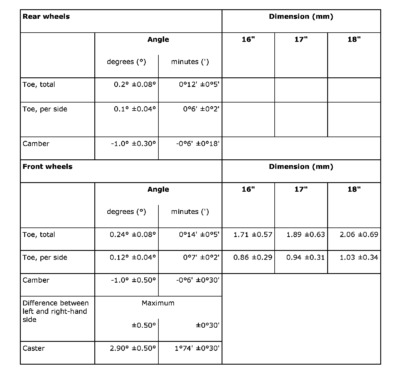 Wheel geometryStandard chassis