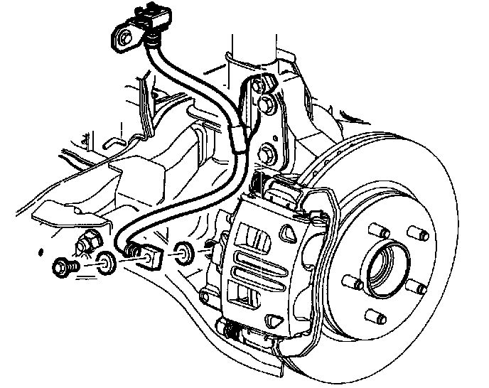 3. Remove brake hose from caliper. Plug openings in caliper and brake hose to avoid fluid loss and contamination.