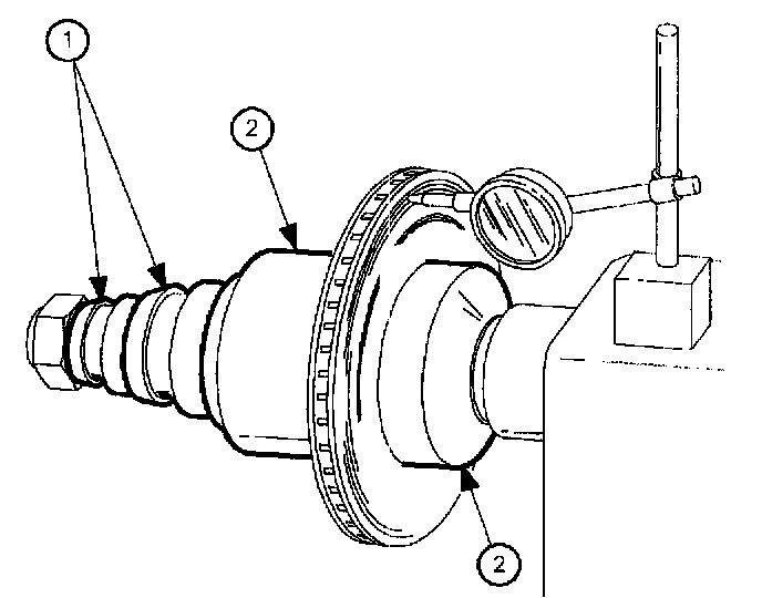 5. Use a magnetic dial indicator base and a dial indicator with graduations of one ten-thousandth of an inch (0.002 mm (0.0001 inch) to make sure rotor turns squarely on brake lathe. Attach dial indicator on brake lathe and check rotor runout. Mark highest point of lateral runout on rotor. Loosen attachment hardware and rotate rotor 1800 while holding inside (2) bell clamp in its original position. Tighten attachment hardware and recheck rotor runout. Any runout must follow rotor. The marked high spot must remain high spot. If not, some problem exists in attachment of rotor on lathe, such as bent bell clamps, incorrect bell clamps, or untrue mounting surfaces.