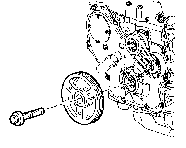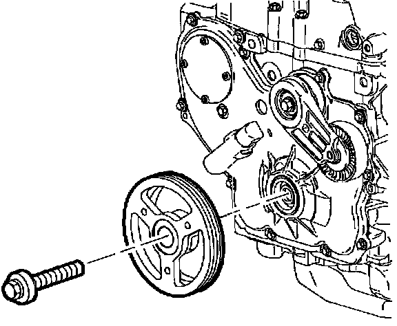 18. Remove crankshaft balancer pulley bolt and pulley. Discard pulley bolt.