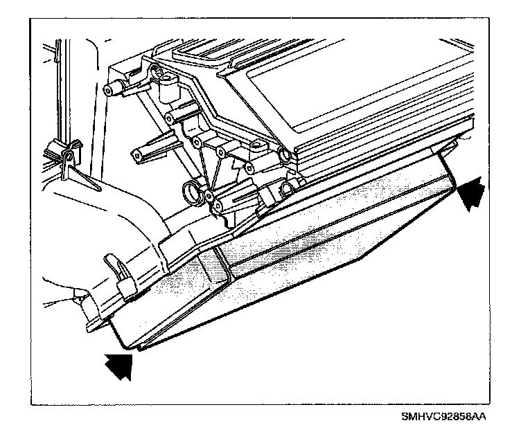 11. Grasp heater core at end tanks and remove (spraying perimeter of heater core seal with a soap and water mixture will ease removal).