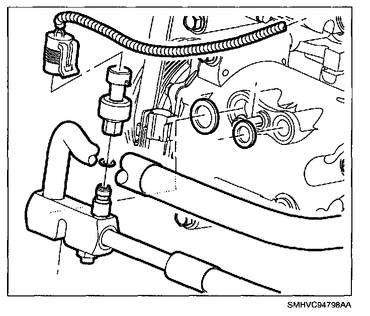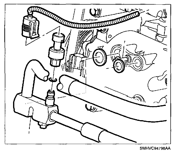 2. Hand start A/C pressure sensor onto pressure port taking care not to pinch O-ring and tighten.