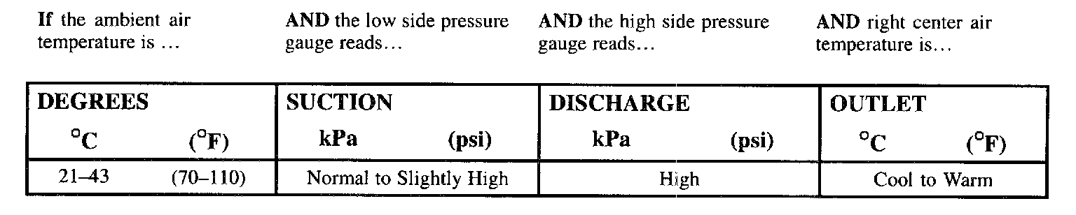 ^ An overcharged condition will generate a poor and/or intermittent cooling complaint at higher ambient air temperatures. Intermittent complaints are caused by the pressure switch cycling the compressor Off and On.