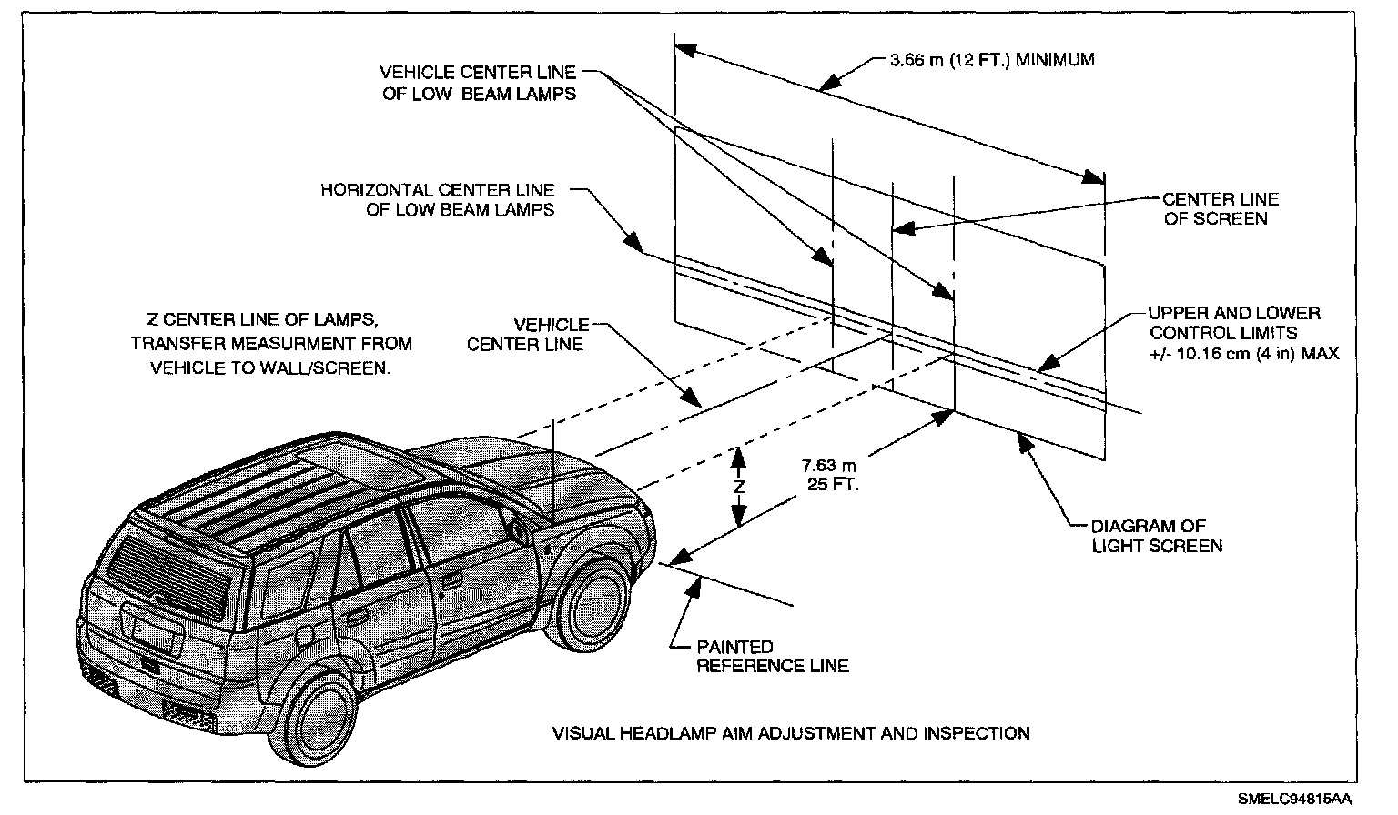 Using an adjustment screen of at least 4 m (13 ft) wide and 2.5 m (8.2 ft) high, square vehicle to the screen and position vehicle, so that the headlamps are 7.6 m (25 ft) from screen. The weight of the vehicle driver and a 1/2 tank of fuel must be included in adjustment procedure to assure accurate adjustment.