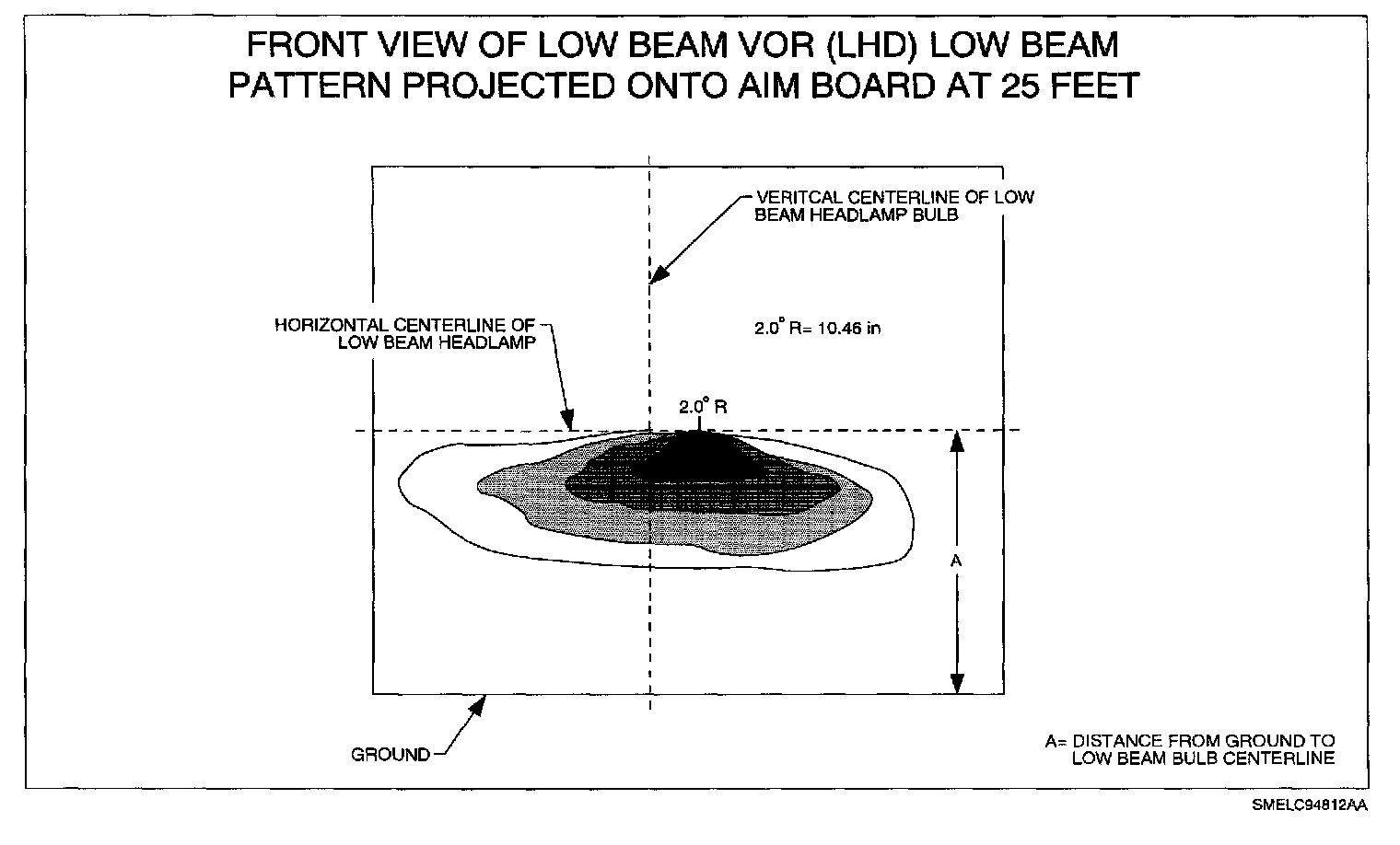 Turn low beams on and adjust headlamp beam, so that the beam hot spot is located to the right of the vertical headlamp centerline and even with the horizontal headlamp centerline. Vertical beam adjustment is accomplished by turning the adjustment screw located on the top of the headlamp bracket. The headlamps do not have any horizontal beam adjustment.