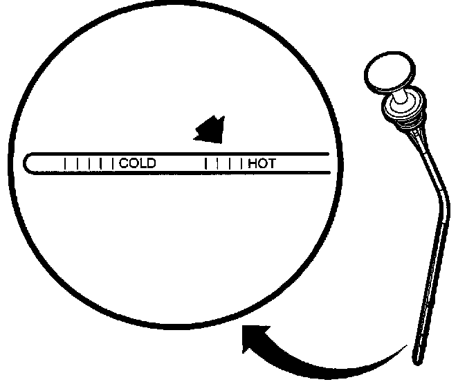 6. Remove the fluid level indicator and verify that the ATF level is within the "HOT" level markings as indicated on the fluid level indicator.
