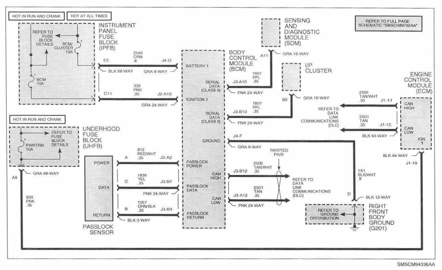 In order to correctly diagnose a no start condition, battery voltage must be above 11 volts and the engine must be cranking at normal cranking speed (above 200 rpm). Fuel level and fuel quality in the fuel tank should be checked (do not solely rely on the fuel gauge for level reading). When the engine is cranked, the BCM will check the password from the passlock sensor. If the password is not received within a certain amount of time or does the match the BCM password, the BCM will send a "fuel disable password" to the ECM over the CAN bus. The SECURITY telltale will flash and the engine will not be allowed to start. If the passwords match, the BCM will send the password over the CAN bus to the ECM. If the ECM password does not match the BCM password; or if the ECM does not receive a password from the BCM, it will allow the engine to start then stall within 4 seconds. The SECURITY telltale will flash for 10 minutes if the ECM receives no password, an incorrect password or a disable fuel command. If the password to the ECM is correct, the engine will operate normally. The password is sent continuously by the BCM to the ECM during run mode. If the password becomes lust or incorrect during the drive cycle, the vehicle will be allowed to start on succeeding ignition cycles without the aid of passlock and the SECURITY telltale will be On steady. This mode is called fail enable mode.