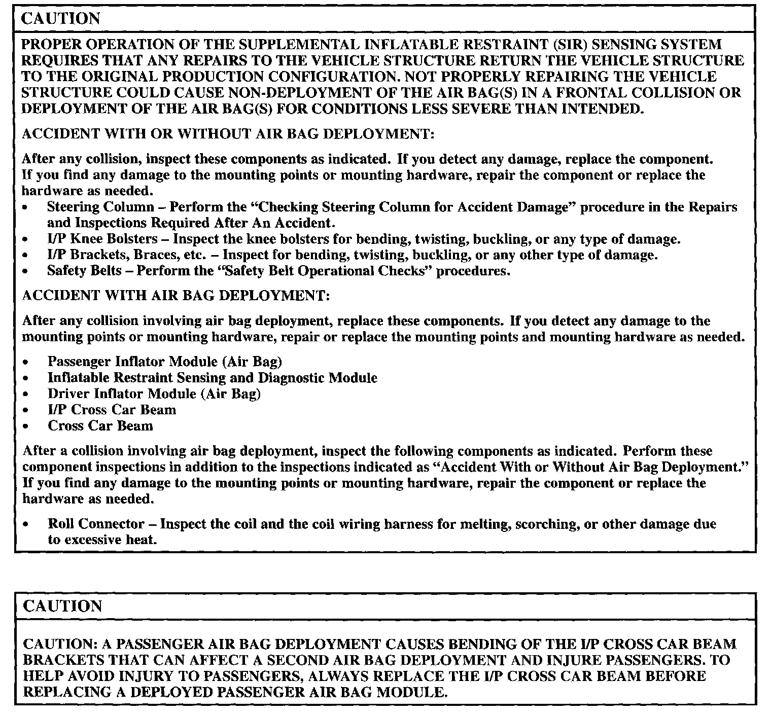 ^ INSPECT SIR SYSTEM COMPONENTS AFTER AN ACCIDENT, EVEN IP AIR BAGS DID NOT DEPLOY.