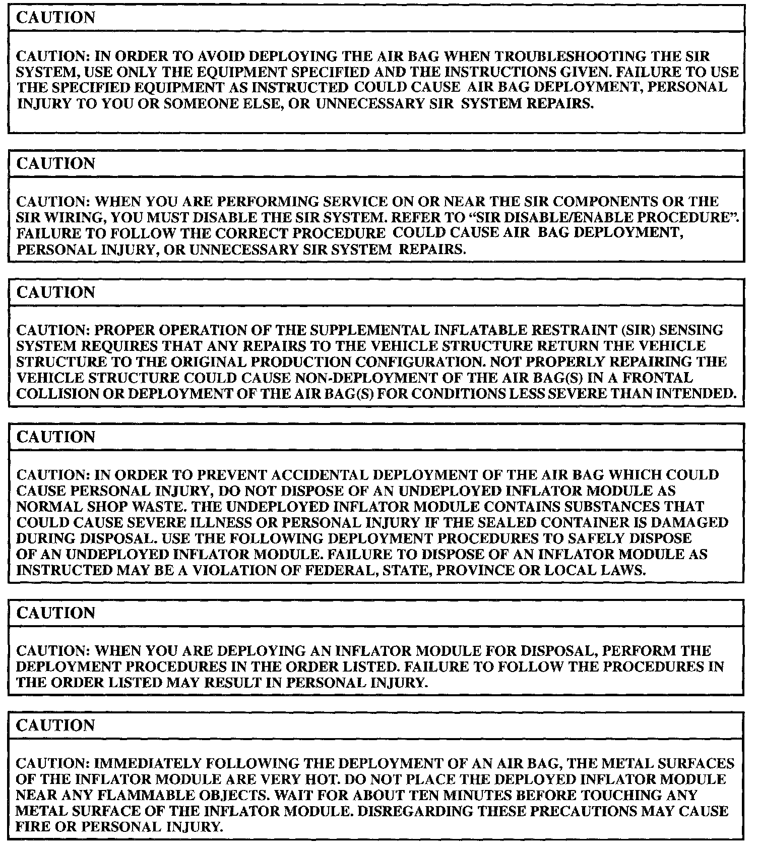 ^ DISABLE THE SIR SYSTEM WHEN WORKING ON OR NEAR THE SIR SYSTEM COMPONENTS.