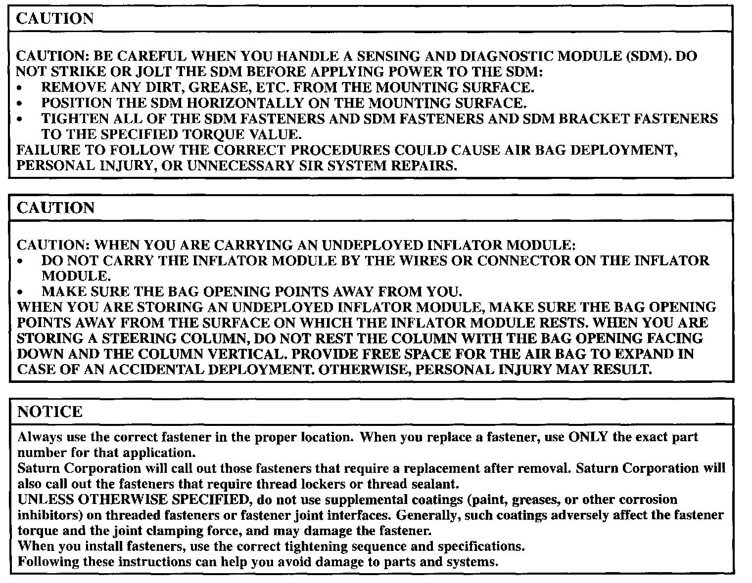 ^ USE SPECIAL CARE WHEN HANDLING OR STORING SIR SYSTEM COMPONENTS.