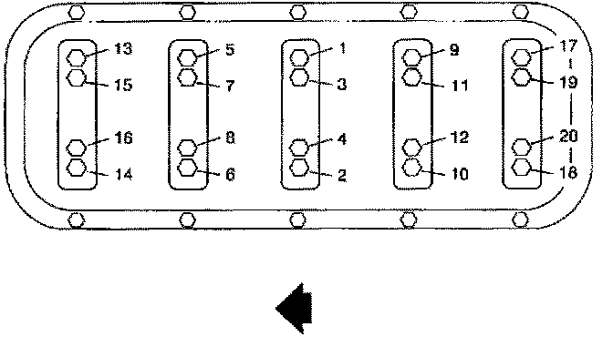 ^ Install and tighten crankshaft bearing bolts using tightening sequence.