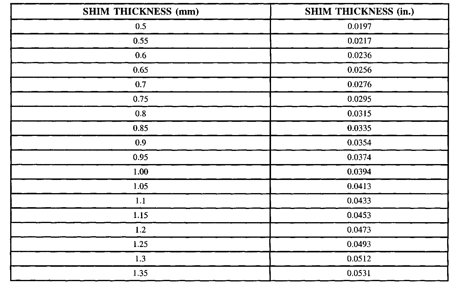 SHIM SIZE SPECIFICATIONS