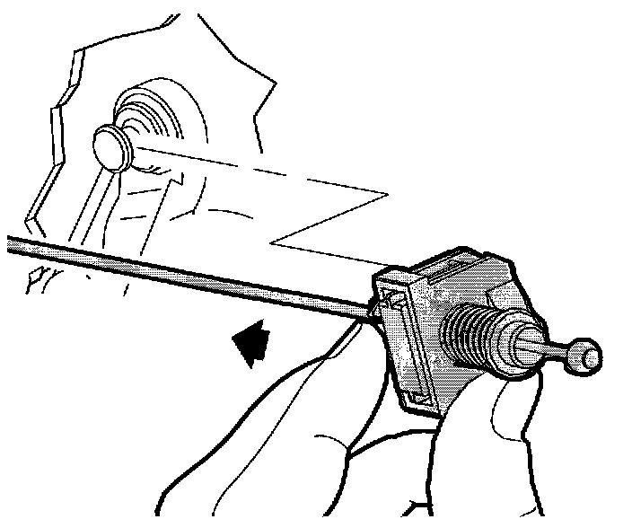 3. Install park lock cable end terminal onto control assembly by aligning cable fitting to pin and pushing forward. When installing, be sure not to install cable end fitting on an angle or push down on cable portion as this may cause cable to misadjust.
