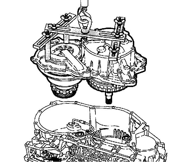5. Using a suitable lifting device, carefully lift case cover assembly (with forward clutch and input shaft) out of the Build Plate Assembly J44337 and lower into transaxle case assembly.