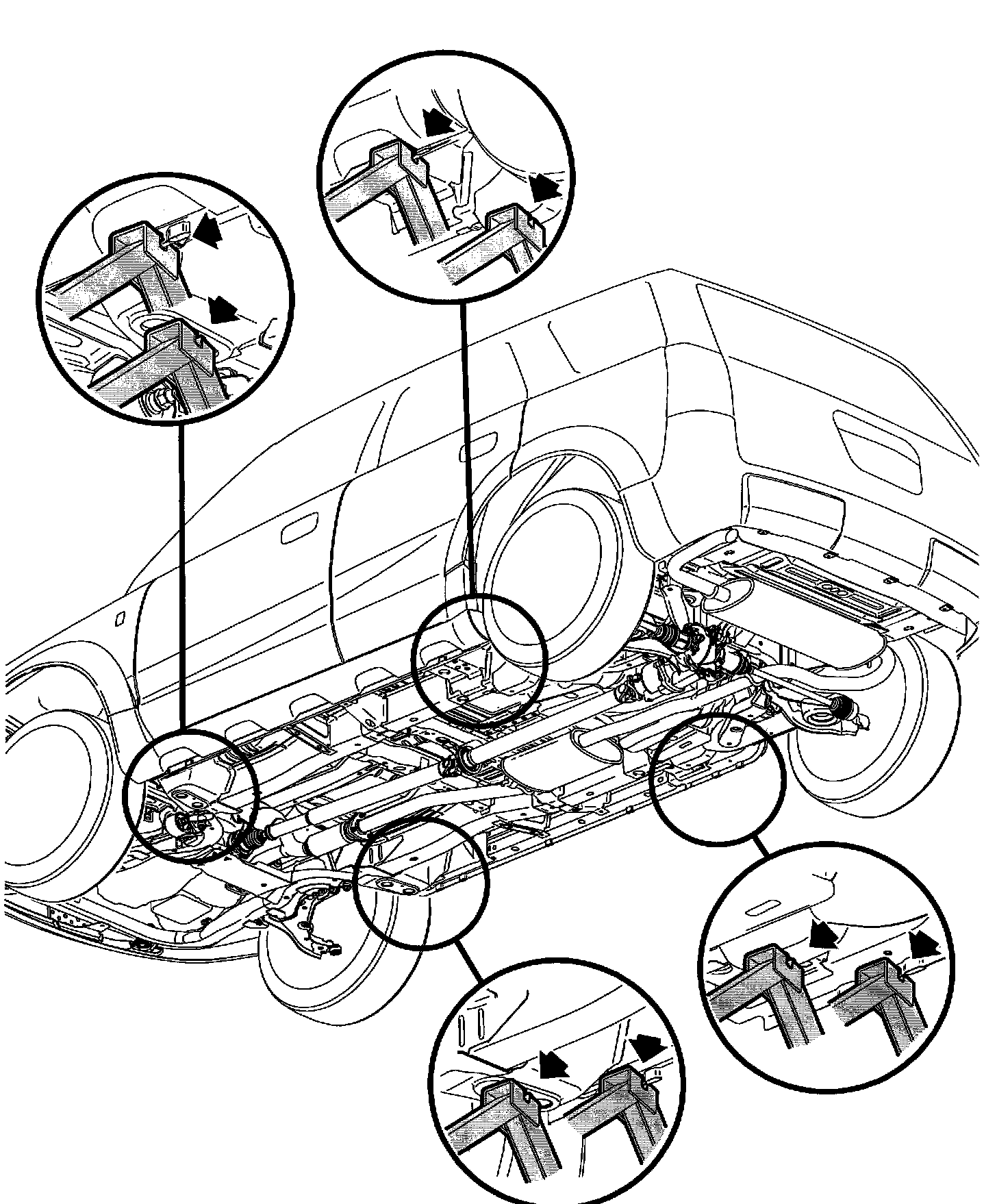 LIFTING, JACKING AND SUPPORT POINTSCAUTION: TO HELP AVOID PERSONAL INJURY WHEN A VEHICLE IS ON A HOIST, PROVIDE ADDITIONAL SUPPORT FOR VEHICLE AT THE OPPOSITE END FROM WHICH COMPONENTS ARE BEING REMOVED. THIS WILL REDUCE THE POSSIBILITY OF VEHICLE FALLING OFF HOIST.