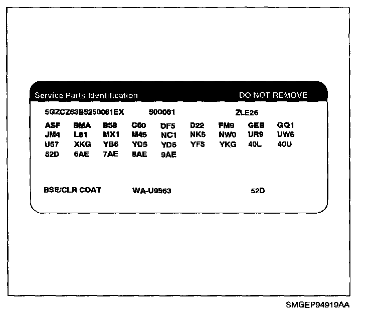 Service Parts Identification LabelThe figures show the service parts identification label and how to read it. This label provides identification of vehicle equipment to help in servicing and determining replacement parts. Included on this label will be regular production options (RPOs), standard and mandatory options.