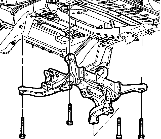 CAUTION: FAILURE TO PROPERLY SUPPORT THE REAR SUSPENSION SUPPORT ASSEMBLY CAN CAUSE THE SUPPORT TO DROP TO THE GROUND WHEN MOUNTING BOLTS ARE REMOVED.