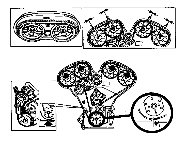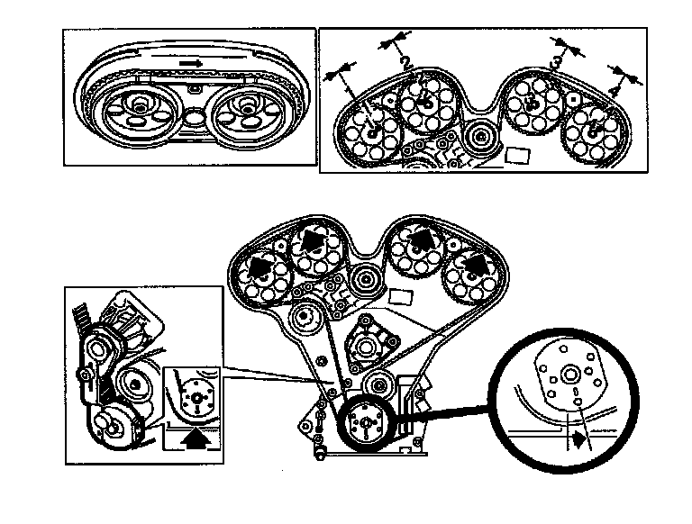 8. Route belt around #3 and #4 camshaft sprockets while aligning belt marks to marks on sprockets and rear cover.
