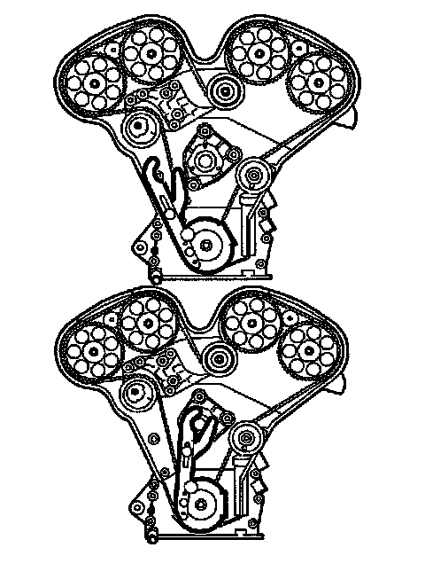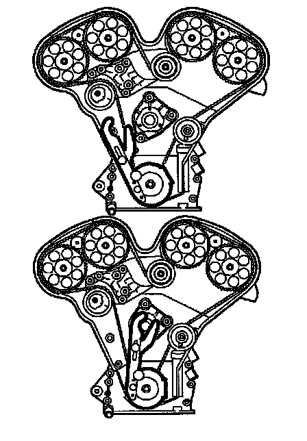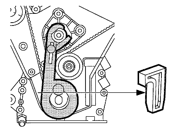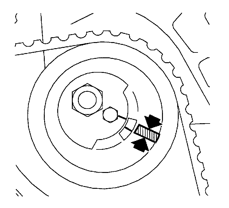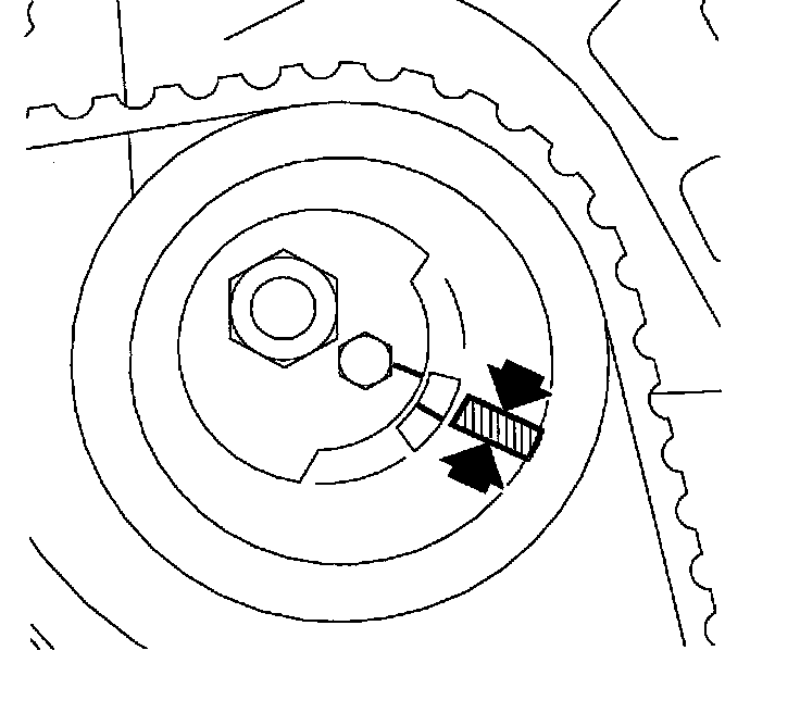 16. Adjust the timing belt tensioner that the center alignment mark is approximately 3 mm (1/8 inch) above the alignment on the spring loaded idler.