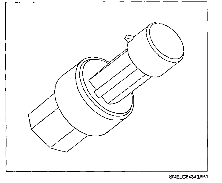 The Air Conditioning (A/C) pressure sensor is located in the A/C high side pressure refrigerant line in front of the radiator. The pressure sensor is a transducer that varies resistance according to the absolute pressure inside the high side refrigerant line. The sensor is used by the ECM to turn the cooling fan On if the A/C high side pressure is greater than 1247 kPa (181 psi) during A/C operation. The ECM will not turn Off the cooling fan until the pressure drops below 824 kPa (120 psi). The sensor is also used by the ECM to turn Off the A/C relay if the refrigerant pressure is not within 314-3043 kPa (46-441 psi). The normal maximum range of the sensor can vary from 0.25 volts at 101 kPa absolute (14.7 psi absolute) to 4.75 volts at 3400 kPa absolute (453 psi absolute).