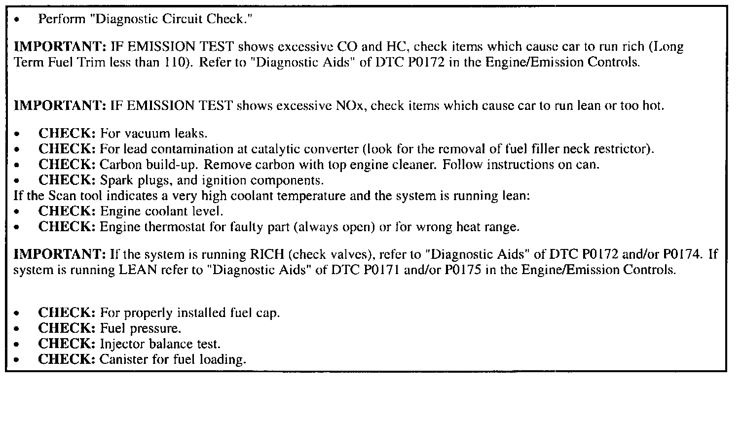 ^ If emissions test indicates excessive NO, check for items which cause vehicle to run lean or too hot. Refer to diagnostic chart and emission symptom chart.