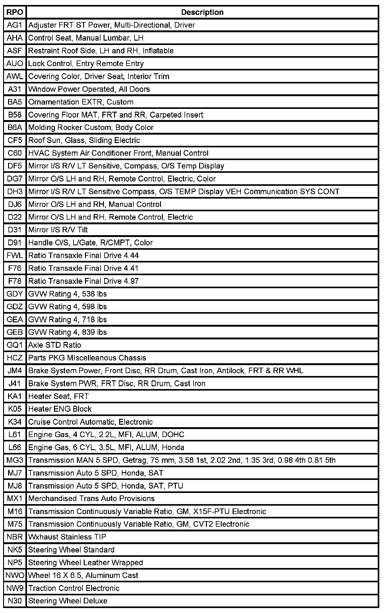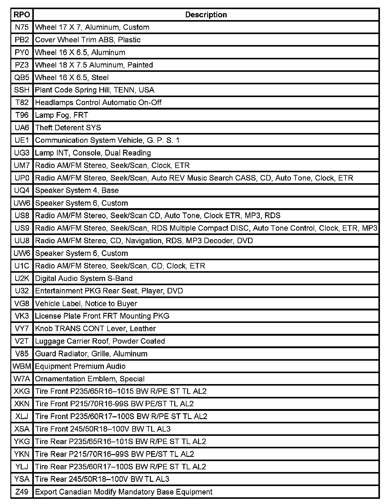 The table provides the description of the Regular Production Option (RPO) codes that are available on the vehicle. The vehicle's RPO list is printed on the Service Parts Identification Label.