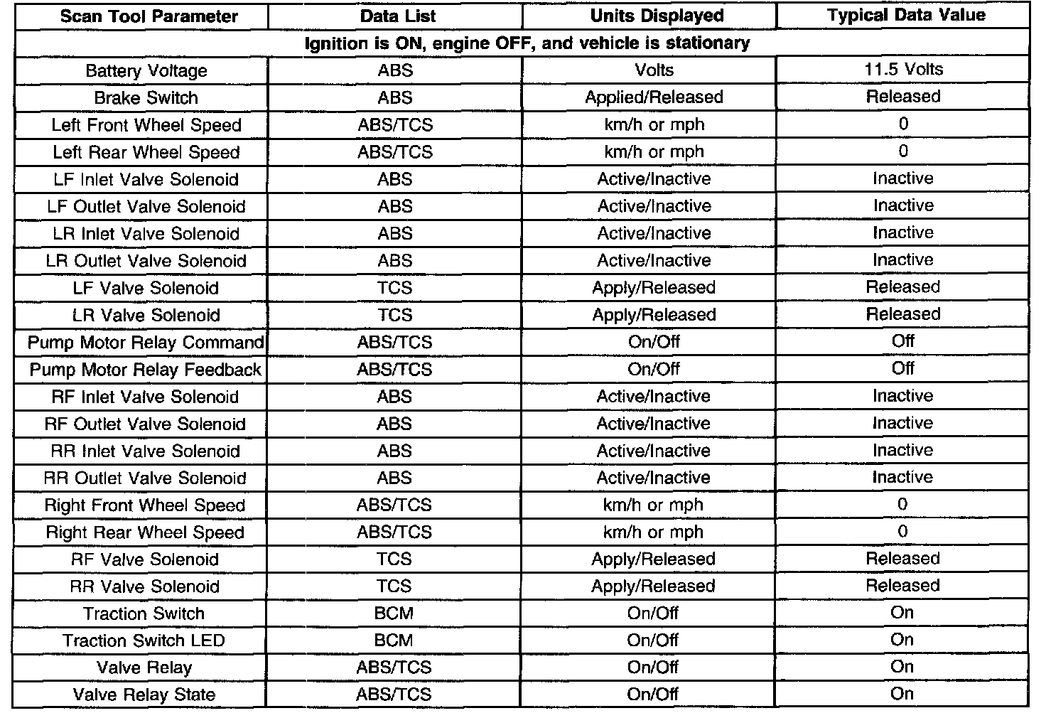 Use the EBCM Scan Tool Data Lists as directed by a diagnostic table or in order to supplement the diagnostic procedures. Begin all the diagnostic procedures with the antilock brake system (ABS) Diagnostic Starting Point. Use the EBCM Scan Tool Data Lists only after the following is determined: Diagnostic Starting Point - Antilock Brake System