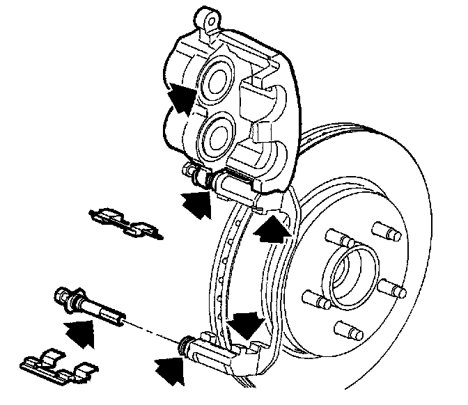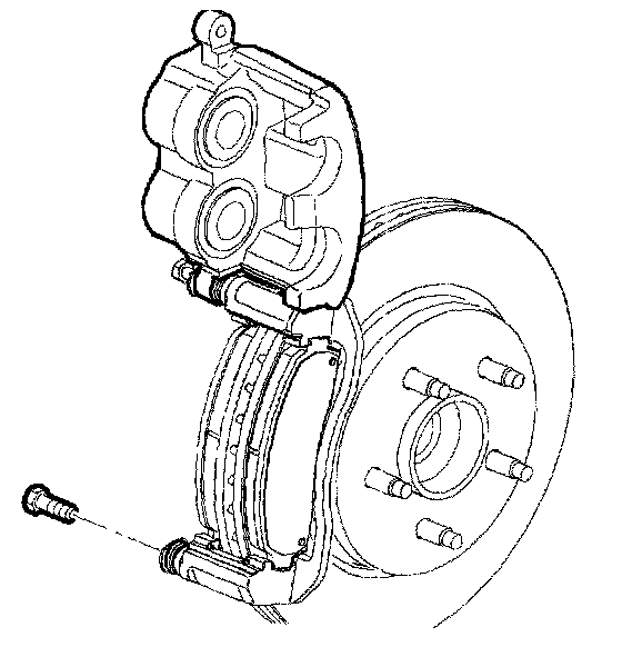 Notice: Support the brake caliper with heavy mechanic's wire, or equivalent, whenever it is separated from it's mount and the hydraulic flexible brake hose is still connected. Failure to support the caliper in this manner will cause the flexible brake hose to bear the weight of the caliper, which may cause damage to the brake hose and in turn may cause a brake fluid leak.