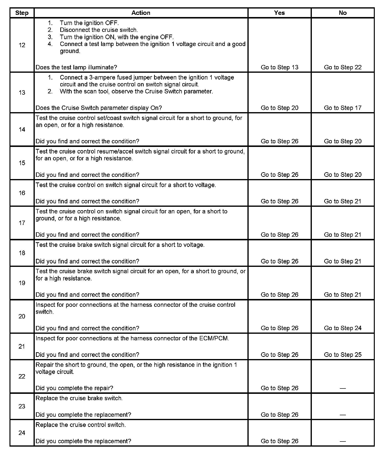 - Observe the cruise set/coast and cruise resume/accel parameters in the scan tool PCM General Info Inputs data list while rotating the steering wheel to both stops and pressing and holding the steering wheel control switches. This will eliminate the possibility of a internally open or shorted inflatable restraint steering wheel module coil.Rotate the steering wheel to both steering stops while separately activating each cruise control switch. With a scan tool, observe the associated cruise control switch parameter in the PCM General Info - Inputs data list. This will help eliminate the possibility of a internally open or shorted inflatable restraint steering wheel module coil.