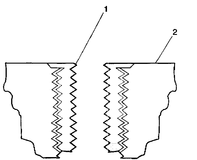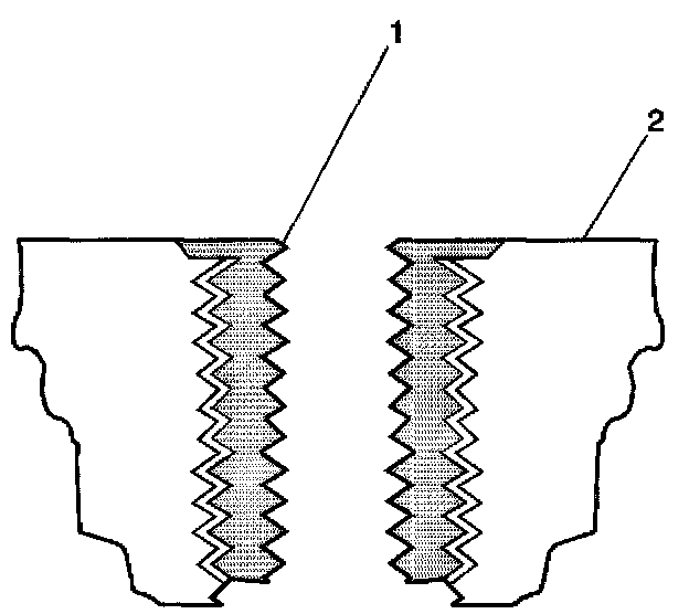 The thread repair process involves a solid, thin walled, self-locking, carbon steel, bushing type insert (1). During the bushing installation process, the driver tool expands the bottom external threads of the insert into the base material (2). This action mechanically locks the insert in place. ALSO, when installed to the proper depth, the flange of the insert will be seated against the counterbore of the repaired hole.