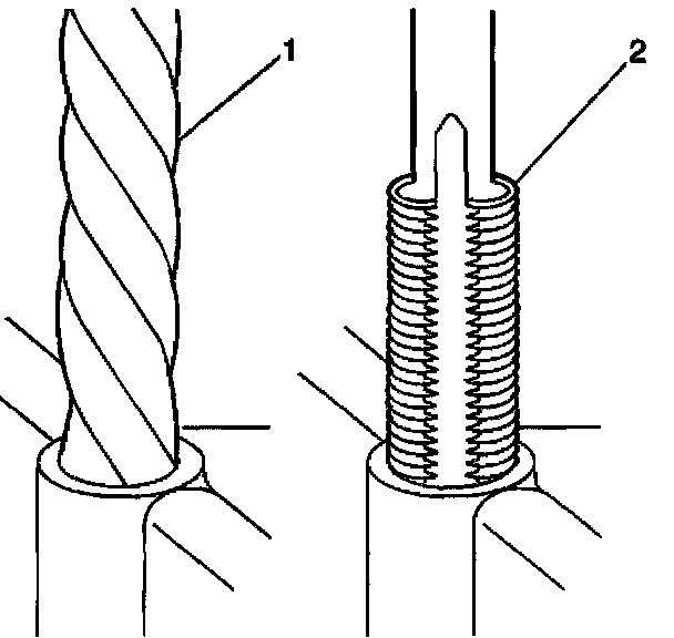 5. Using a tap wrench (2), tap the threads of the drilled hole.