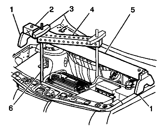 5. Install the J 43405 (6) to the engine support fixture hooks.