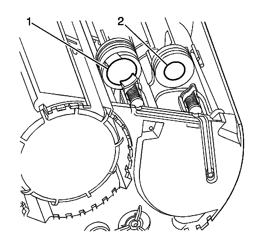 The primary jet pump (1) is located in the primary fuel tank module. Fuel pump flow loss, caused by vapor expulsion in the pump inlet chamber, is diverted to the primary jet pump and the secondary jet pump (2) through a restrictive orifice located on the pump cover. The primary jet pump fills the reservoir of the primary fuel tank module.