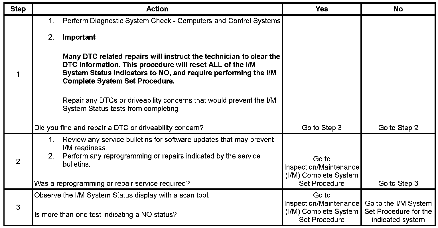 For the specific DTCs required for each system, refer to Inspection/Maintenance (I/M) System DTC Table . Systems such as fuel delivery, misfire, and comprehensive components may not be listed in a system status list. These tests run continuously and do not require an I/M System Status indicator. Inspection/Maitenance (I/M) System (DTC) Table