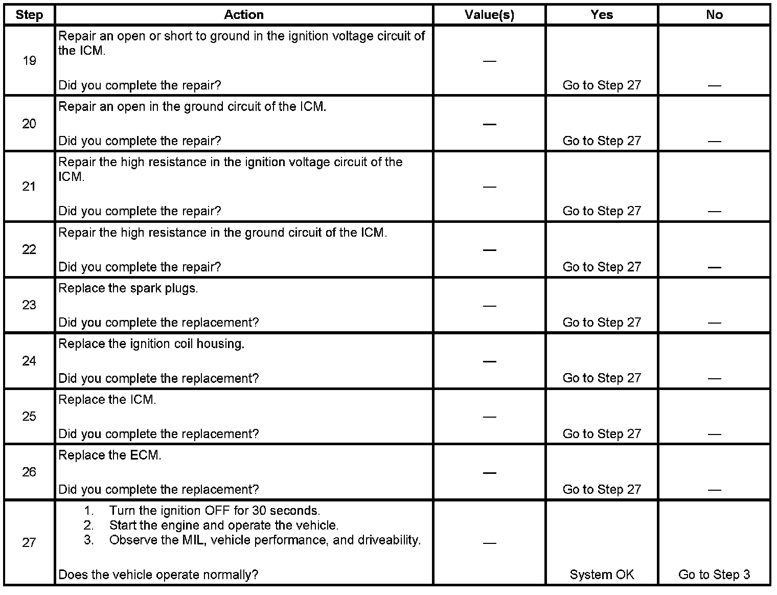 Each ignition coil supplies secondary voltage to a pair of spark plugs. This is called a waste spark ignition system. The engine control module (ECM) supplies a signal on each of the ignition control (IC) timing control circuits to the ignition control module (ICM). The ICM fires the correct ignition coil at the correct time based on the signals. The ICM detects if cylinder 1 or cylinder 3 is on the compression stroke by sensing the secondary voltage and polarity of each side of the ignition coil. The ICM detects this voltage with sensing circuitry integrated into each ignition coil. The higher voltage is on the compressing cylinder. This is called compression sense ignition. The ICM provides a synthesized cam signal to the ECM based on these inputs. The ECM uses the cam signal to synchronize fuel injection.