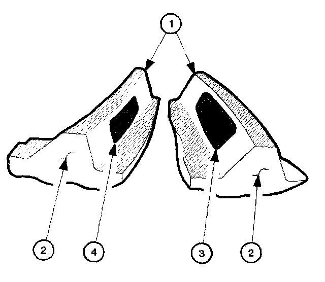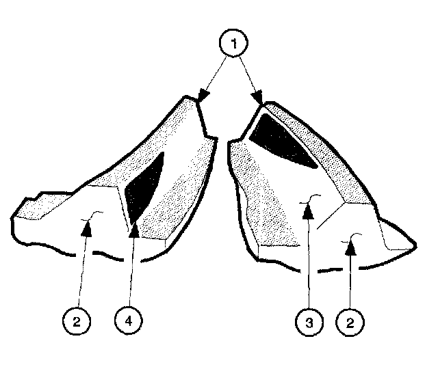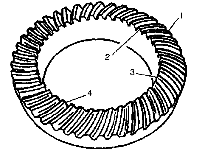The side of the ring gear tooth which curves outward, or is convex, is the drive side (4). The concave side is the coast side (3). The end of the tooth nearest the center of the ring gear is the toe end (2). The end of the tooth farthest away from the center is the heel end (1).