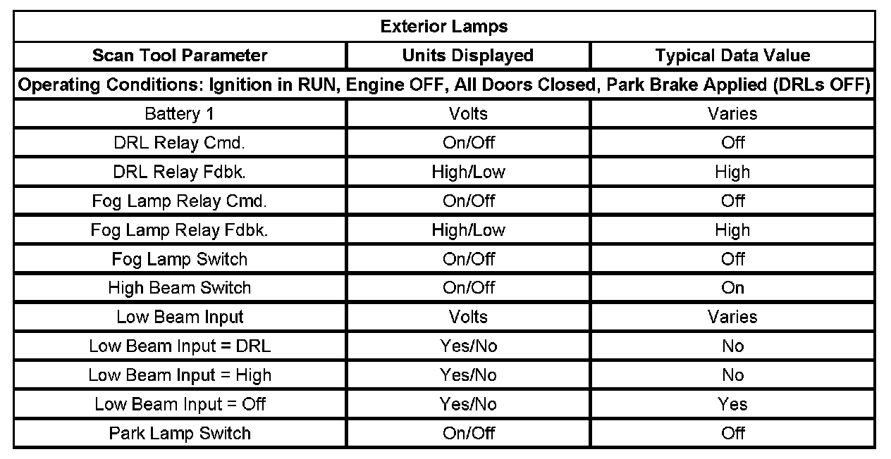 Scan Tool Data List - Exterior Lamps