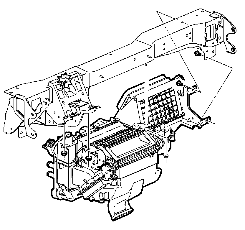 IMPORTANT: Make sure the plastic molded in bracket at the center of the HVAC module is forward of the cross car beam during installation.