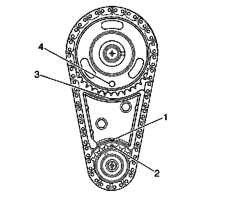 Align the timing mark on the camshaft gear, center line of the locator hole (4), with the timing mark on the top of the chain dampener (3).
