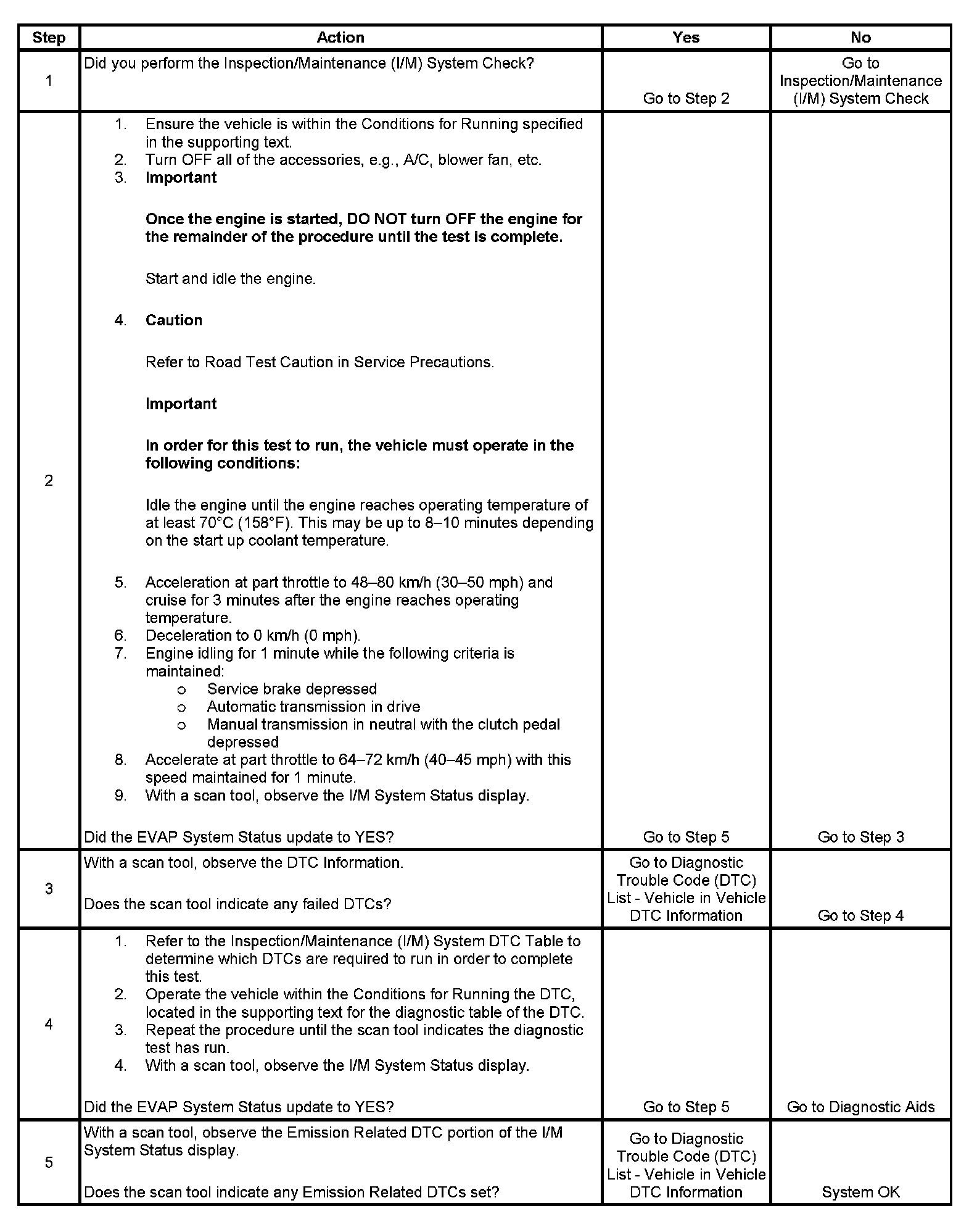 Extreme high or low ambient temperatures may prevent the EVAP System Tests from initiating. Performing a visual inspection prior to running the EVAP System Set Procedure may prevent having to repeat the test. A loose fuel cap may cause a test to abort or fail and prevent the I/M System Status from updating. A failed or aborted test will require the vehicle to cool down in order to meet the enable criteria to run another test.
