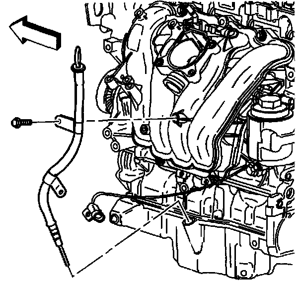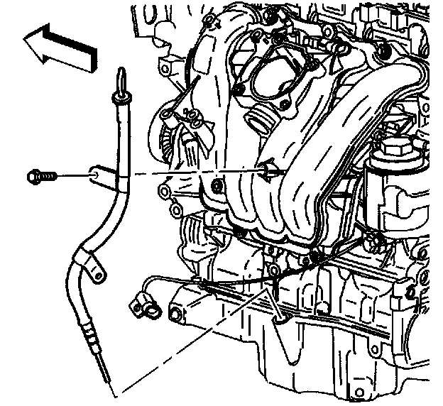 21. Remove the oil level tube bolt and rotate tube away from the manifold.