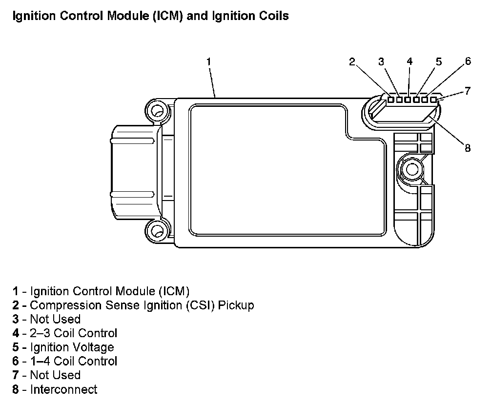 The powertrain control module (PCM) supplies a signal on each of the ignition control (IC) timing control circuits to the ignition control module (ICM). The ICM fires the correct ignition coil at the correct time based on the signals. The ICM detects if cylinder 1 or cylinder 3 is on the compression stroke by sensing the secondary voltage and polarity of each side of the ignition coil. The ICM detects this voltage with sensing circuitry integrated into each ignition coil. The higher voltage is on the compressing cylinder. This is called compression sense ignition. The ICM provides a synthesized cam signal to the PCM based on these inputs. The PCM uses the cam signal to synchronize fuel injection. This system consists of the following circuits: