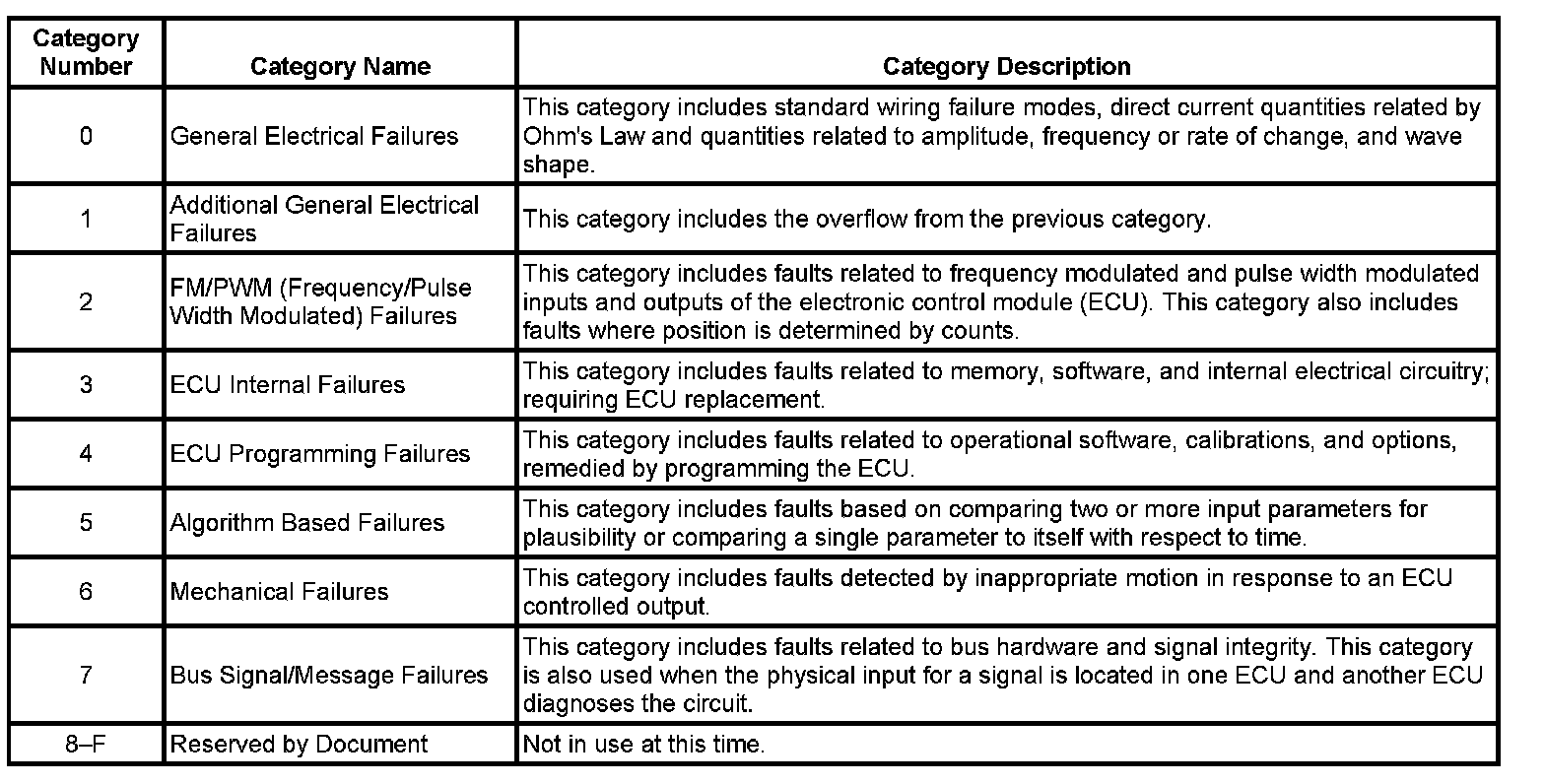 The DTC symptom is made up of 2 alphanumeric digits. The first digit following the DTC indicates the DTC symptom category. There are 16 possible categories available in the range of 0 through the letter F. Currently there are 8 categories in use, 0 through 7. These 8 categories together with their definitions are given.