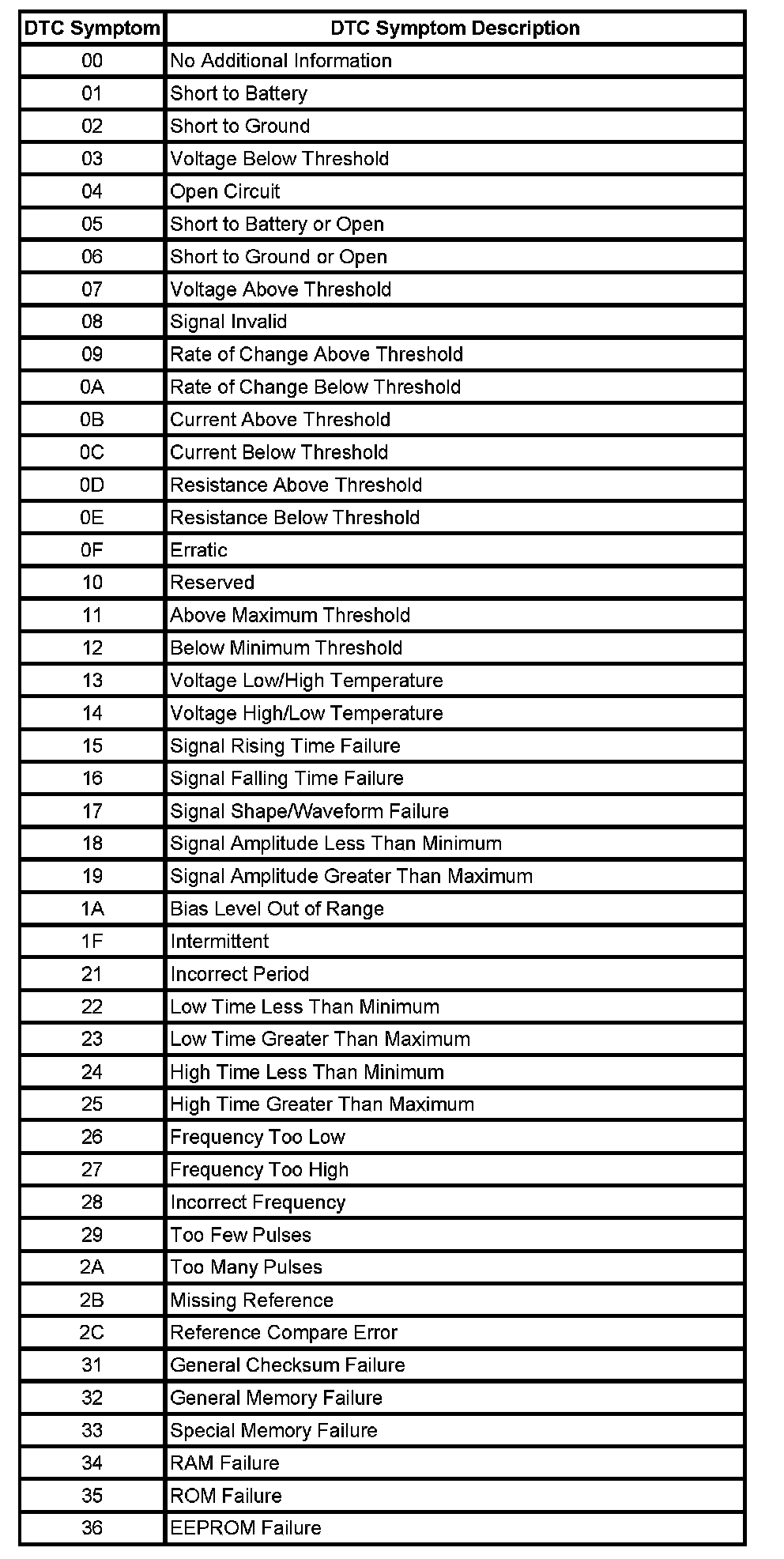 A DTC symptom is a 2-digit number which adds additional detail to a DTC. The DTC symptom provides additional information without requiring a large increase in the number of new DTCs.