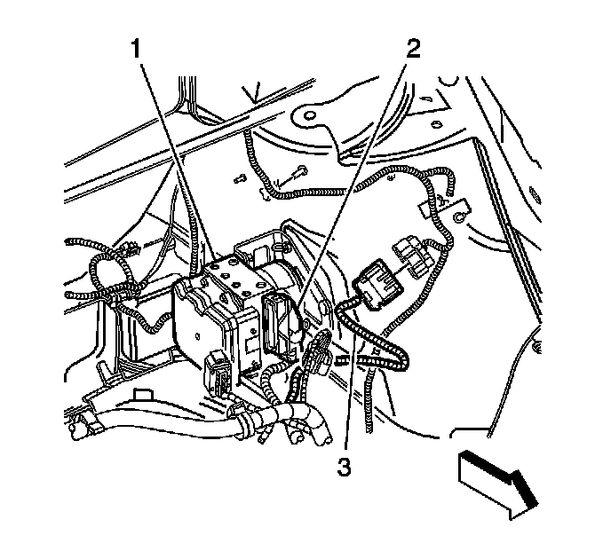 3. Disconnect the electronic brake control module (EBCM) harness connector (2).