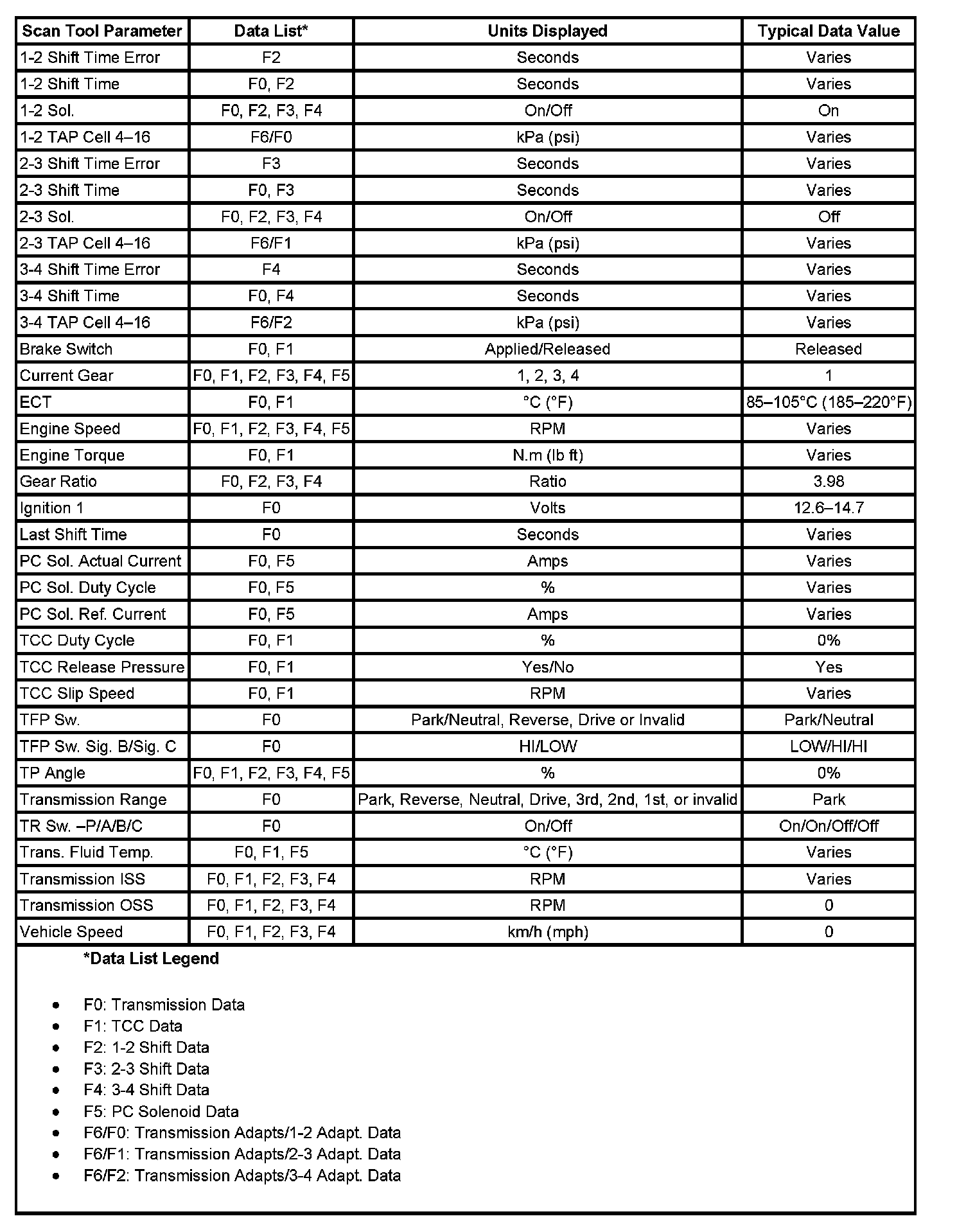 Only the parameters listed below are used for diagnosing. If a scan tool displays other parameters, the values are not recommended by General Motors for use in diagnosis.