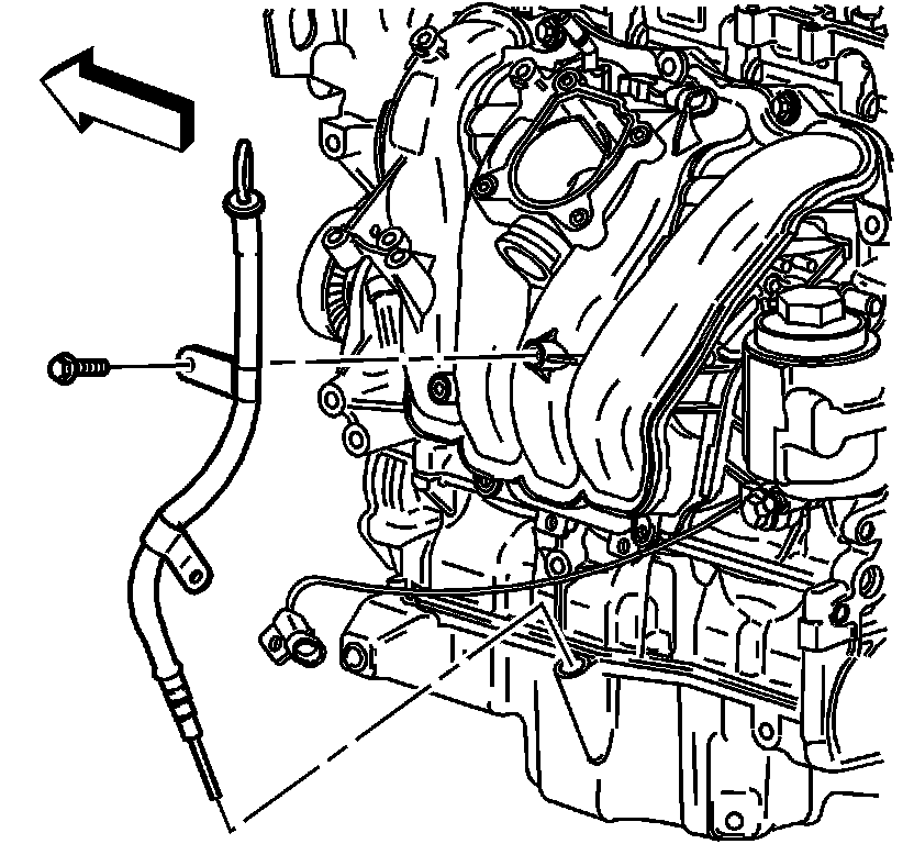 21. Remove the oil level tube bolt and rotate tube away from the manifold.